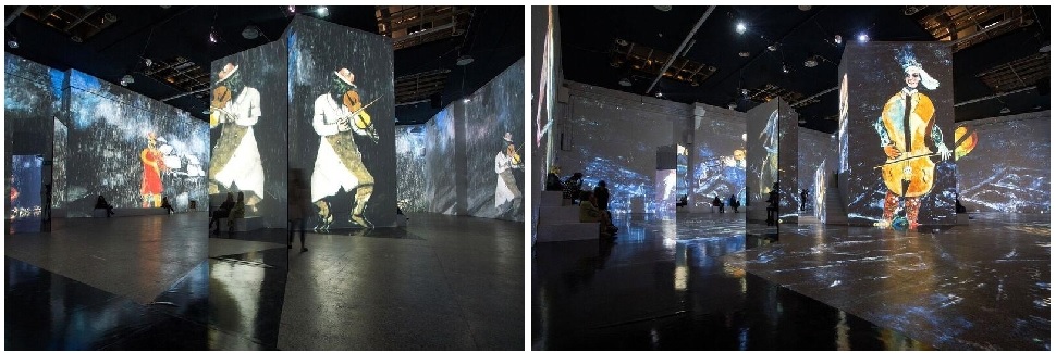 The exhibition/show takes you on a journey through twelve macro sequences, telling his life story. It starts with Vitebsk, where Chagall was born. The artist frequently depicted his hometown, for instance in his famous Over the Town, where the artist floats above the roofs of this small town in Belarus, holding his beloved Bella in his arms.